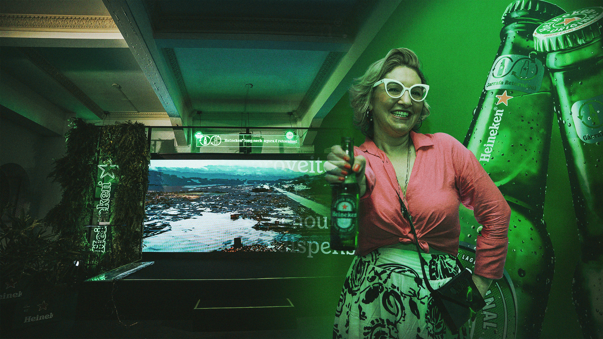 Event held at the Martinelli Building in São Paulo to launch Heineken's new longneck bottle, which is now returnable. In addition to the entire set design, we designed custom displays for the proper disposal of empty bottles.